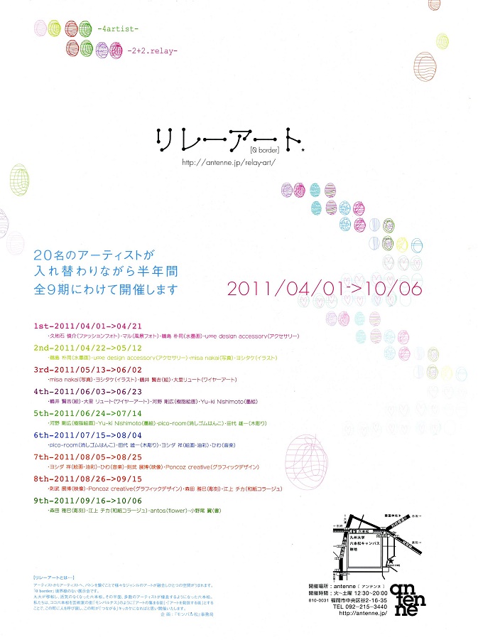 詳細 http:// 僕は第1弾と第2弾に参加してます。 展示数は少ないですが、宜しかったら美味しいコーヒーを飲みにいらしてください♪ 『リレーアート』 ~ φ border ~ 【リレーアートとは・・・】 アーティストからアーティストへバトンを繋ぐことで、 様々なジャンルのアートが融合しひとつの空間がうまれます。 九大が移転し、活気のなくなった六本松。 その反面、多数のアーティストが棲息するようになった六本松。 私たちは、ココ六本松を芸術家の街「モンパルナス」のように 「アートの集まる街」・「アートを発信する街」とすることで、 この町に人を呼び戻し、この町が「つながる」キッカケになればと思い開催します。 総勢20名のアーティストが全9期にて入れ替わりにて半年間開催します。 (2011/4/1~10/6) 【第1弾】 久地石 慎介 kuchiishi shinsuke 1979 10 20生まれ 佐賀生まれ福岡育ち/studio river→日本ジャーナリスト専門学校→細谷事務所→free photographer/出版物 2007/j rock groupies p192/ katana http://kuchiishi.com/ マル♪写真 山、滝、太陽などの風景や気になったお店の料理の写真など主に九州北部で活動中 愛機:Panasonic GF1 u∞e design accessoryアクセサリー ”分身のような、手放せないアクセサリー” を福岡を拠点に製作しています。 http://ameblo.jp/orangelide/ 鵜島 朴同 書/水墨画 http://bokudou.biroudo.jp/ 福岡市六本松にて書画会【杉乃会】を主宰しています。 所属団体/アーティストワークスLamp(http://lamp.sunnyday.jp/) テーマは「花とファッション」です。 どうぞお時間ある方はお越し下さいませ!! |
