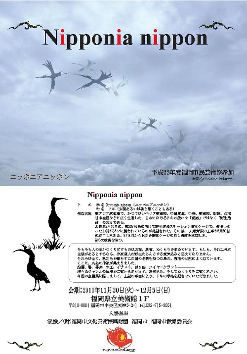 ◆平成22年度 福岡市民芸術祭参加 展覧会 ▼Nipponia nippon ニッポニアニッポン ▼2010年11月30日(火)~12月5日(日) ▼福岡県立美術館1F 810-0001 福岡市中央区天神5-2-1 tel.092-715-3551 ▼入場無料 ▼主催 アーティストワークスLamp ▼後援 (財)福岡市文化芸術振興財団/福岡市/福岡市教育委員会 ▼内容 9名の作家による合同展覧会です。 ▼ニッポニアニッポン趣旨 そもそも人の手がつくりだすものは、 共存、共有、ぬくもりを求めています。 もしも、それ以外の主張があるとするなら、作家個人の 野生たらんとする意気込みと思えてなりません。 それらはすべて、私たちが暮らすこの国の名前を持つ鳥の、 現在の状況によく似ています。 ここに、9名の作家が集まりました。 絵画、書、写真、木工、イラスト、切り絵、ワイヤークラフト、、 様々なジャンルの展示がご覧いただけます。 意気込み、そしてぬくもりをご覧ください。 今回の企画展に際しまして、上記の事由により、 トキの学名を冠させていただきました。 ▼展示作家 書/水墨画 鵜島 朴同 切り絵/イラスト 飯田 幸博 絵 鶴井 賢吉 家具/木工 松永 慎一朗 水彩画 山口 ヒロビロ 写真 中井 美沙 イラスト ヨシタケトモミ 絵画 江上 チカ ワイヤークラフト 大里リュート PR |