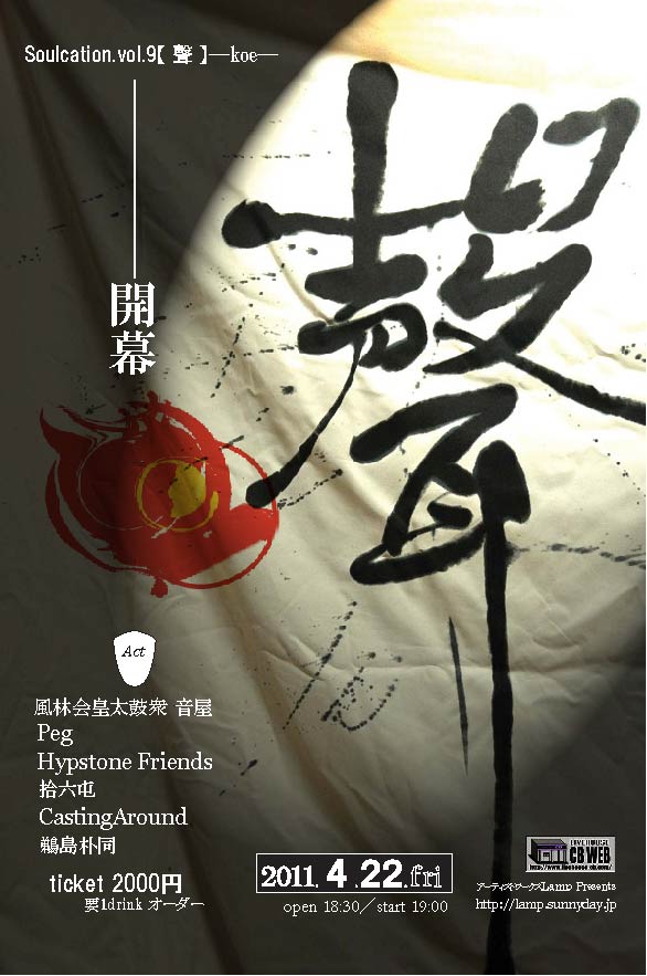 渾身の力で企画させていただきました! 最高の出演者ばかり!是非ともお越しくださいませ!! ◆soulcation.vol9 【 聲 】 ―koe― Soulcationとは、ソウル・コミュニケーションの造語略。 音楽ライブ+美術実演で行なわれるアーティストワークスLampの音楽イベント名。 「目の前で」展開される、そのライブ感が感動や勇気に変わる― 第9回目の今回は水墨画、和太鼓、福岡で凌ぎを削る4バンドが参加。 どんな瞬間でも、『聲』になる。 とっておきの喝采を捧ぐ。 ▼4/22(金) ▼ オープン18時半 スタート19時 ▼チケット 2000円 (要1オーダー) ▼会場 ライブハウスCB http:// 福岡市中央区長浜3-1-13 ▼出演 ▲風林会皇太鼓衆 音屋 http:// ▲Peg http:// ▲Hypstone Friends http:// ▲拾六屯 http:// ▲CastingAround http:// ▲鵜島 朴同(水墨画実技) http:// ▼主催 アーティストワークスLamp http:// |