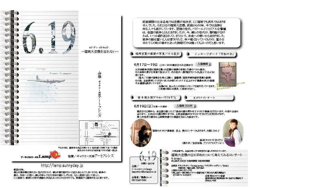 今年は地震、津波、原発についてなど、色々と考えることが多い年になっています。 僕は思うのです。 国、という単位ではなく、人、という単位について。 そうすれば、おのずから国というものもまた、見えてくるような気がいたします。 今回の企画では展示3日間、催し一時間半となっています。 どうぞ是非、たくさんのご来場をお待ちしています。 >>> 【6.19】 ロク テン イチキュウ~福岡大空襲を忘れない~ ▼会場 ギャラリー天神アートフレンズ 〒810-0001 福岡市中央区天神3-3-5 昭和通り 天神3丁目バス停前 明太子のやまや3F 昭和通フタタより西へ約1分 ▼企画 アーティストワークスLamp http:// ▼協賛 ギャラリー天神アートフレンズ http:// ▼内容 福岡空襲の模様の写真パネル展示/メッセージボード「平和の木」 ◆ 6月17日~19日11:00~20:00(最終日のみ18時まで) <入場無料> 太平洋戦争末期に福岡を襲った空襲の模様の写真と文章のパネル展示。その当時の様子を写真で見ることで、次の世代へ語り継ぎたいことも見えてくるように思います。 (協力/引揚げ港博多を考える集い、葦書房、福岡市博物館学芸員の皆様) ●展示作家 「ヨシタケ」 「江上チカ」 「鵜島朴同」 「中井美沙」 の作品や「川上美香代」「ナポ」「ケン・ジャクソン」「domino」Lampスタッフの想いのこもった作品の他、会場には、色んな人の平和メッセージを貼りだしていきます。 ▼催し ◆6月19日(日)15時~16時半 <入場料 500円> 絵本読み語り「かわいそうなぞう」/オカリナコンサート 最終日の15時から、催しとして「絵本の読み聞かせ」「オカリナ演奏」を行ないます。今回の主旨に合わせて、工夫された読み聞かせでは、土家由岐雄作の「かわいぞうなぞう」を取りあげます。第二次世界大戦中に上野動物園での実話を元にした絵本です。 (「かわいそうなぞう」読み手/生田裕佳.アツコプロダクション) 福岡のオカリナ演奏者、田上 泉のコンサートもあります。お楽しみに♪ ▼主旨 終戦間際の日本各地では空襲が相次ぎ、ここ福岡でも例外ではありませんでした。 6月19日の福岡大空襲、終戦から66年。今では当時を知る人々も減少しています。 僕らは実体験を持たない世代だけれど、僕らが語り継がないと忘れ去られてしまいそうな、戦争の痛み、平和への想い。僕らが学んできた平和の礎(いしずえ)を、もう一度思い出してほしい。 今、僕らの世代が、語り継がなければ、いつか繰り返されてしまうという、未来への想いから始まりました。 戦争の話は重いと人は言うけれど、年々軽くなっていくものの、重みを、せめてこの町が渦中にあった時期だけは語ってもよいのだと思います。 (問) 鵜島(ウシマ)080-5243-9285/lampstory@hotmail.co.jp |